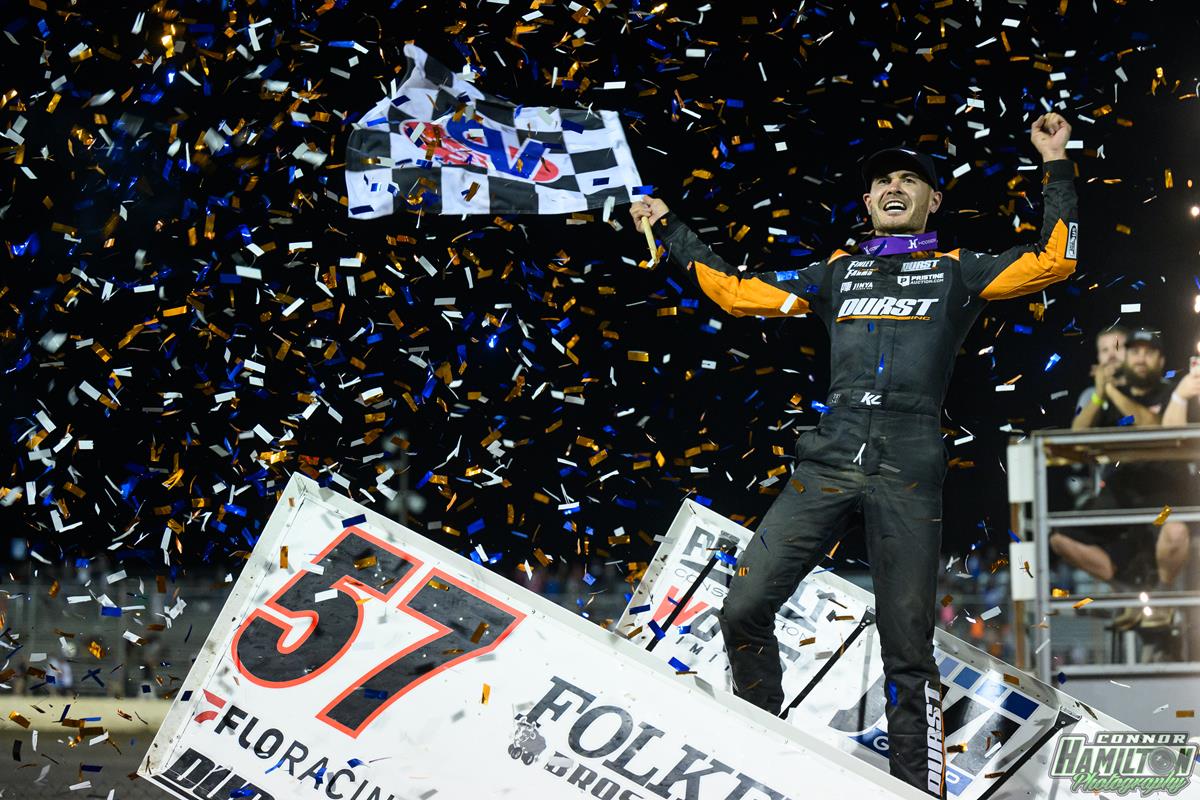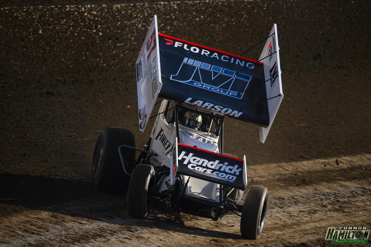 “I’m out of breath,” Larson said. “I’ve been screaming the whole time since I got the checkered flag. I can’t say enough about Paul, Trevor, Doug, everybody on this team for working so hard. We’ve been terrible, and really, really bad tonight, too. And they’ve just been working hard, trying to get the car better each time. I felt like we were pretty good there in the Feature. I felt like we could move around, get my wheels underneath me, and get grip through the center on restarts. I’m just super thankful. This is amazing. There was a kid that came up during the Midget A-main and said, ‘You think you’re going to win tonight?’ And I said, ‘No.’ I did not think we would win. So, this is pretty amazing.”